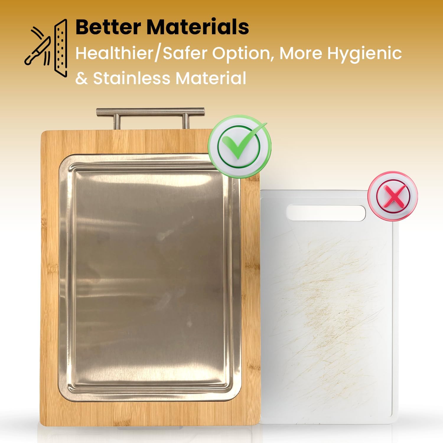 When comparing BambooFlux’s high-quality cutting boards to traditional plastic cutting boards, the advantages are clear. Our non-toxic bamboo and sterile stainless steel cutting boards are safer, more durable, and more eco-conscious, offering a superior alternative to plastic. From their hygiene benefits and knife-friendly surfaces to their aesthetic appeal and premium materials, BambooFlux cutting boards are the best cutting boards you can choose for your kitchen. By choosing a healthy cutting board made from organic bamboo and stainless steel, you’re not only investing in a product that’s safer for you but also contributing to a healthier planet. BambooFlux’s large cutting boards for kitchen use, are designed to handle all your food prep needs with ease, ensuring that every meal is prepared on a surface that’s durable, hygienic, and sustainable. Say goodbye to plastic and welcome the natural beauty and functionality of bamboo and stainless steel into your kitchen today!