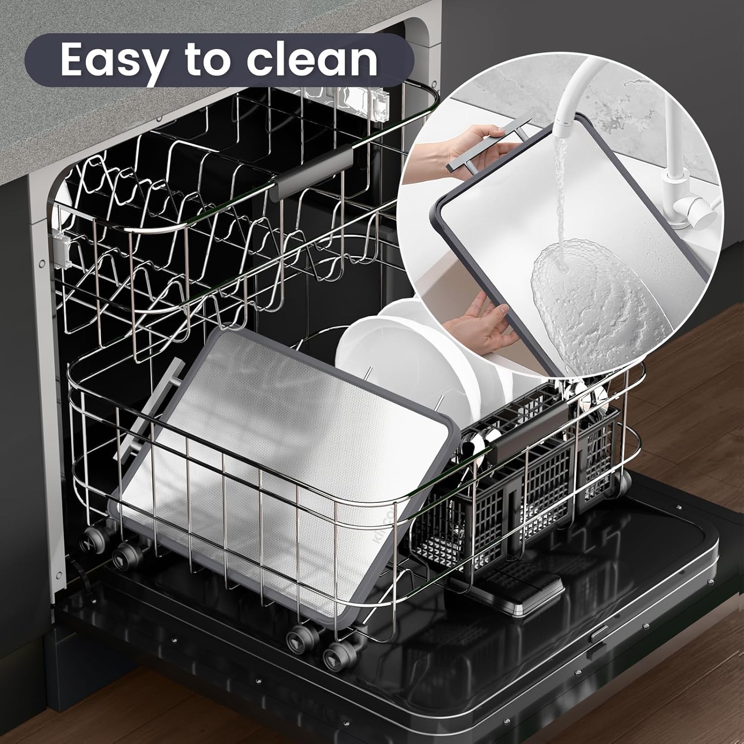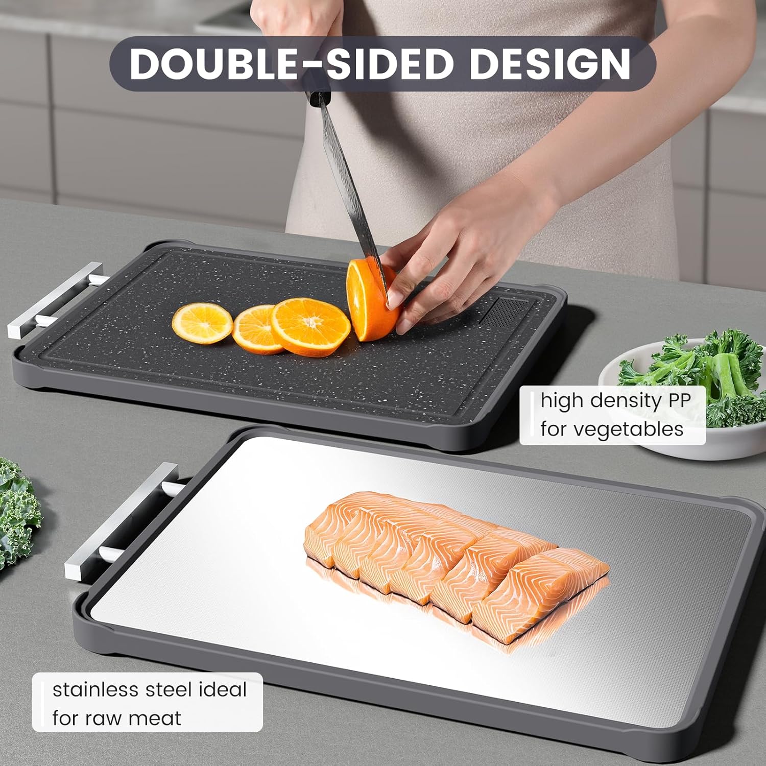 Kikcoin Double Sided Stainless Steel Cutting Boards for Kitchen, Stainless Steel and Wheat Straw PP Large Chopping Board, Black quantity