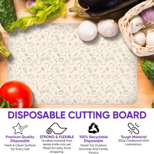Tired of having to constantly wash messy, stained cutting boards after meal prep? Introducing our 30 piece pack of disposable cutting boards, an innovative solution for quick, hygienic, and convenient food prep. Made from recyclable and food-safe lightweight cardboard with a glossy lamination, these cutting boards provide a sturdy prep surface that can withstand all your slicing and chopping needs. The ample 9.8 x 13.5 inch size offers plenty of space for chopping vegetables, cutting meat, and all your other kitchen tasks. Best of all, when you’re done, simply fold up the cutting board and toss it out – no need to scrub your cutting board clean. These disposable cutting boards create a fresh, clean slate for meal prep every time. Their disposable nature makes them ideal for prep while camping or during backyard barbecues – no need to pack bulky cutting boards. They also work great as protective surfaces for arts and crafts with the kids. With each pack containing an amazing 30 disposable cutting boards, they provide value and convenience whether you use them every day at home or just occasionally for trips and events. These lightweight boards are easy to store and take on the go. Discover the smarter solution for quick, easy meal preparation and say goodbye to messy cleanup. Order our 30 piece pack of disposable cutting boards today!